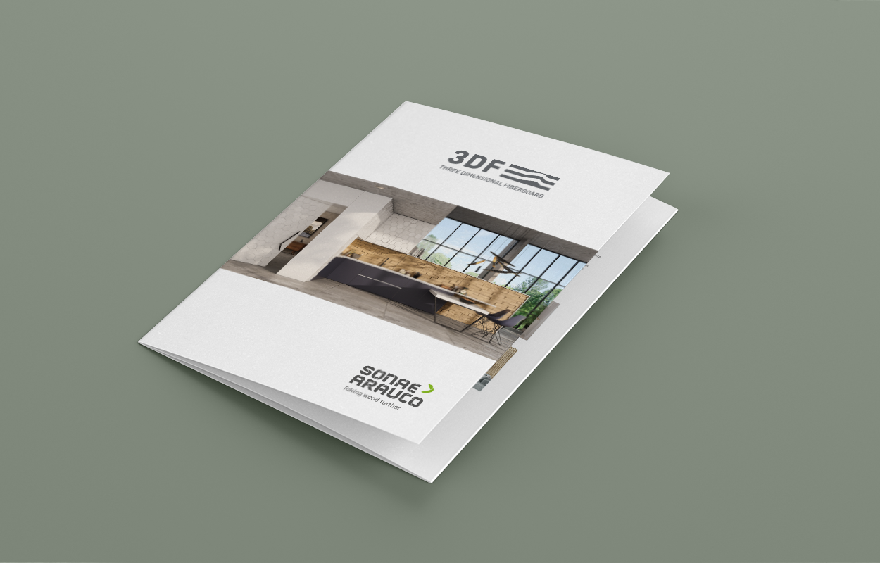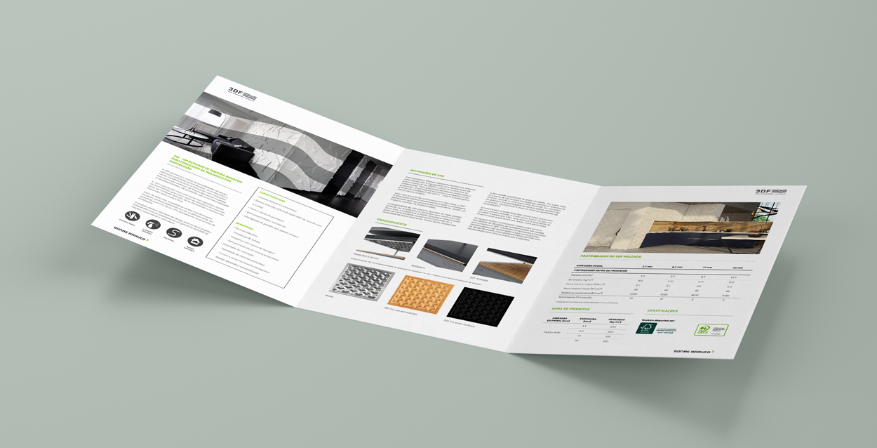 Flyer tríptico do inovador derivado de madeira para a Sonae Arrauco.